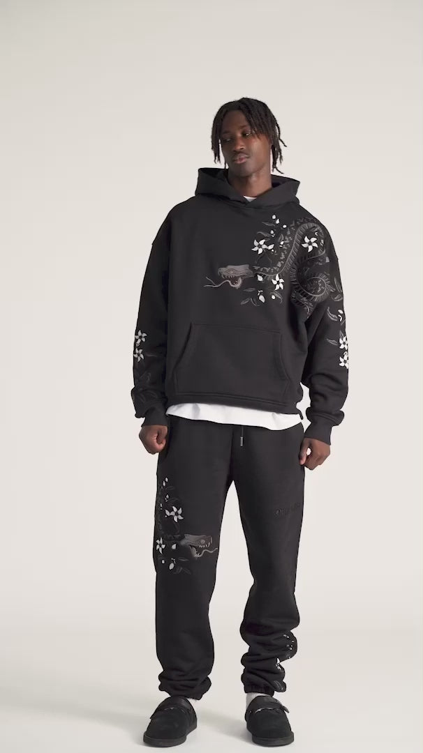 Tailored in our latest offering of 100% organic cotton heavyweight diagonal cotton, these sweatpants in an jet black feature a striking tonal black snake and blossom embroidery across the sides. These sweatpants are cut to an oversized, slouchy fit with an elasticated scrunched hem and tonal drawcords with metallic pullers.