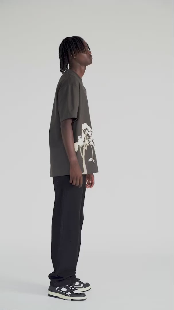 Maßgeschneidert in unserem neuesten Angebot aus 100 % Bio-Baumwolle, Dieses T-Shirt in Khakigrün zeigt auf der Vorderseite ein beige-braunes Baummotiv, ergänzt durch ein beigefarbenes, farblich abgestimmtes 3D-gesticktes Markenlogo auf der Brust. Auf der Rückseite befindet sich am Halsausschnitt der markentypische Riegel in passendem Beige.