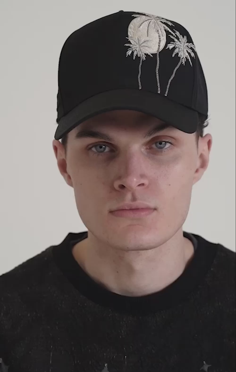 Die Kappe ist auf Vorder- und Rückseite mit beigefarbenen Stickereien versehen, die Palmen vor dem Hintergrund des Sonnenuntergangs darstellen. Dieses filigrane Design ist eine Hommage an die ruhige Schönheit der Wüste bei Nacht. Der Kontrast des glatten schwarzen Stoffes mit der beigen Stickerei sorgt für eine beeindruckende Optik.