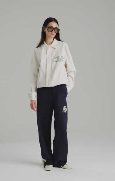 Die Jacke ist aus einem edlen, cremefarbenen Stoff mit dezenter Rippstruktur gefertigt und kombiniert eine entspannte Struktur mit raffinierten Details. Die Silhouette zeichnet sich durch einen scharfen Kragen, einen verdeckten Reißverschluss an der Vorderseite, elastische Bündchen an Ärmeln und Saum sowie saubere Leistentaschen aus und schafft so den Spagat zwischen Schneiderkunst und müheloser Leichtigkeit an der Küste.
