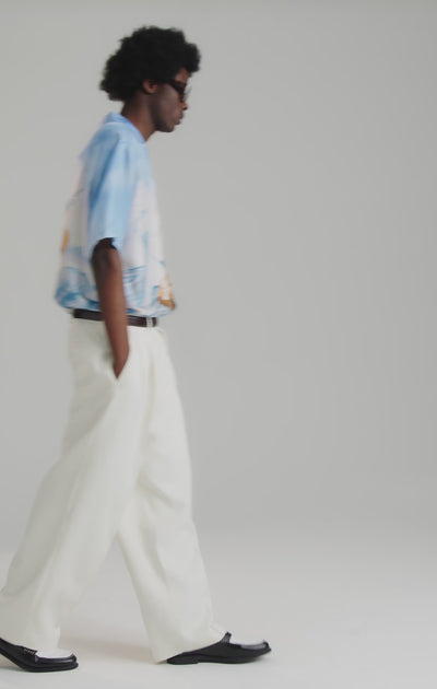 Mit seiner entspannten Silhouette und dem Revere-Kragen schafft das Hemd den Spagat zwischen müheloser Sommergarderobe und gehobener Konstruktion. Die glatte Seidenoberfläche verstärkt die Tiefe und Klarheit des Kunstwerks, so dass jeder Pinselstrich und jede Tonvariation sichtbar bleibt.