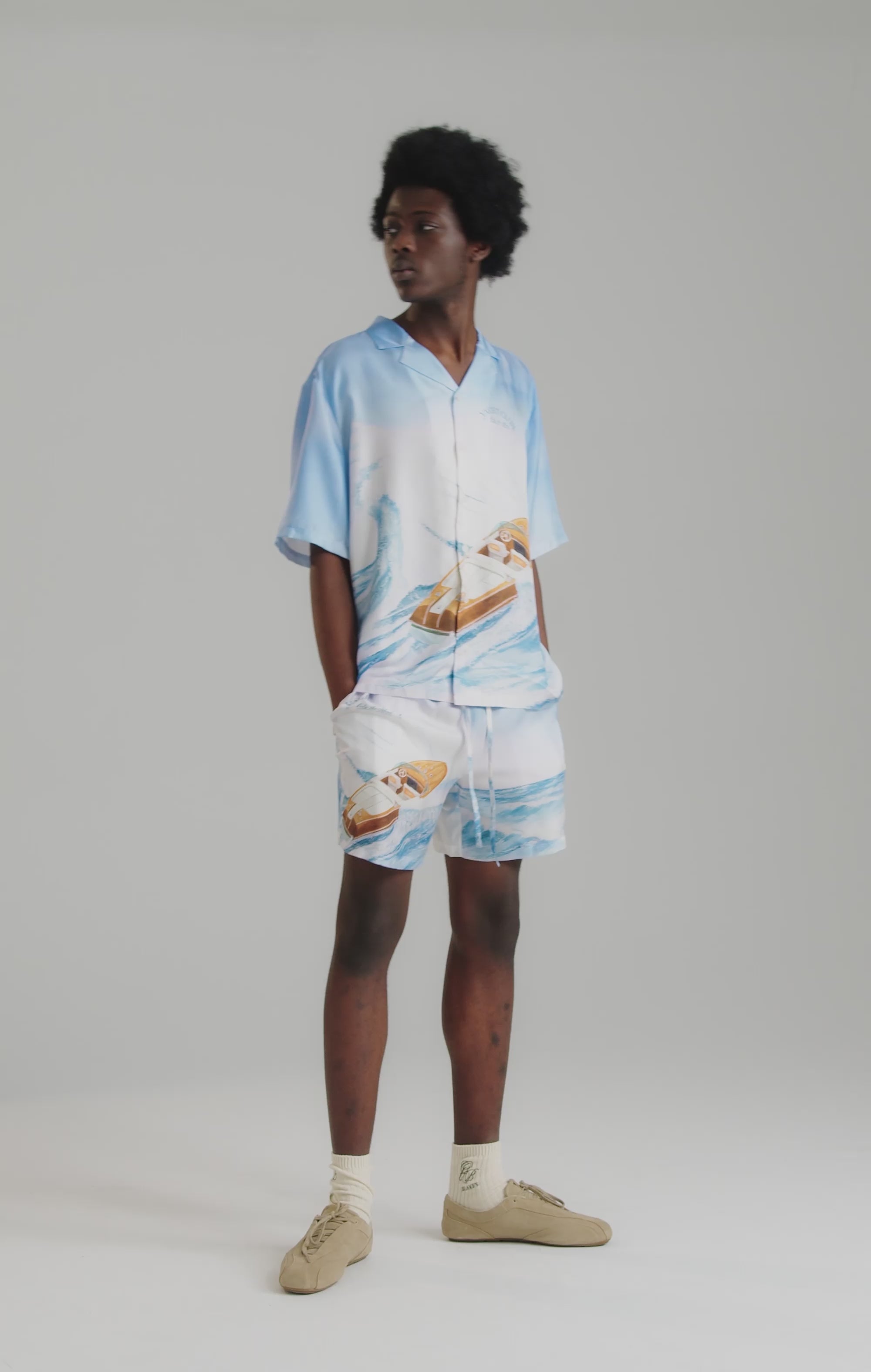 Der aus 100 % Seide gefertigte und in begrenzter Stückzahl produzierte Stoff schmiegt sich mühelos an den Körper und bewegt sich fließend. Der weiche Farbverlauf zwischen Himmel und Meer bildet den Hintergrund für die Vintage-Yacht-Illustration, die an die Häfen von Monaco und die sonnenbeschienenen Küstenlinien erinnert. Die leichte und atmungsaktive Seidenkonstruktion verleiht der Shorts ein raffiniertes, gehobenes Gefühl - sie eignet sich gleichermaßen für einen Urlaub am Urlaubsort oder als Statement-Sommerlook.