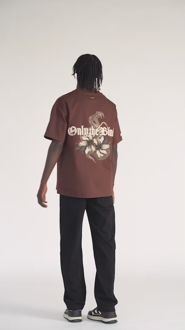 Maßgeschneidert in unserem neuesten Angebot aus 100 % Bio-Baumwolle, dieses T-Shirt in einem satten Braun verfügt über eine beige und braune Schlange Kunstwerk auf der Rückseite mit erhabener 3D-Stickerei, ergänzt durch ein farblich passendes Blumenkunstwerk auf der Brust mit gesticktem 3D-Branding.